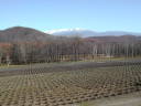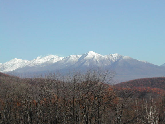 この岡から十勝岳連峰ががパノラマとなって見渡せる。息を呑む美しさ。富良野市街の遥か上方に雪をかぶった山々が横たわっている。その山嶺は太陽の光に当たって、神々しく銀色に輝いて見えた。(下の写真)