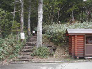沼山峠休憩所の入山口沼山峠休憩所で記念撮影をして、5人のウェルエイジ(well age)は装備をチェックして歩き始めた。このコースは最初に沼山峠まで100mほどの高低差を登るが、あとはよく整備された木道を下るだけで大江湿原に導いてくれる。したがってスニーカーでも十分なのだ。