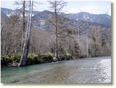 鉄分が多く茶褐色をした通称“ドブ池”(だれがこんな名前をつけたのでしょう?)を過ぎると、前方には穂高の嶺が見え隠れし、左手に梓川の清冽な流れが顔を出します。周辺一帯を残雪と雪解け水が覆い、その水を集めて細い支流を作っています。