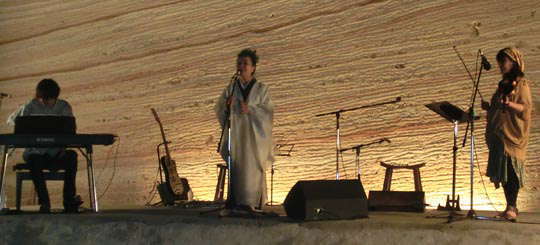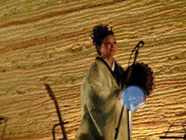 奄美上布に包まれた朝崎郁恵さんが土舞台に、天から舞い降りてきたかのようにすーっと現れた。